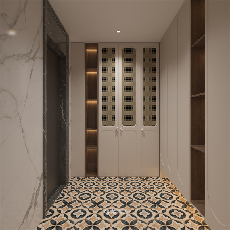 玻璃窗格拱形門搭配經典的黑色門框,黑天鵝般的高貴感醞釀出高級的氛圍。獨特的藝術磚塊點綴,復古的氛圍又加深了幾分。
