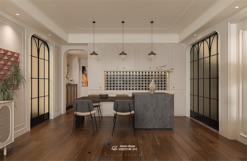 石材與木材組成餐桌島臺一體式的臺面,餐桌臺面依稀可見木頭原始的紋理,天然的氣息與法式家居里復古的氛圍融合得恰到好處,更為空間增添了一抹隨性之美。