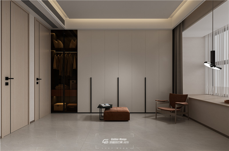 忙碌是生活的常態(tài),選擇安放精致讓自己鮮活起來。床尾的衣柜以虛實結合的體塊感呈現出來,相異的色調在其間碰撞交錯,演繹靈動隨性之美。