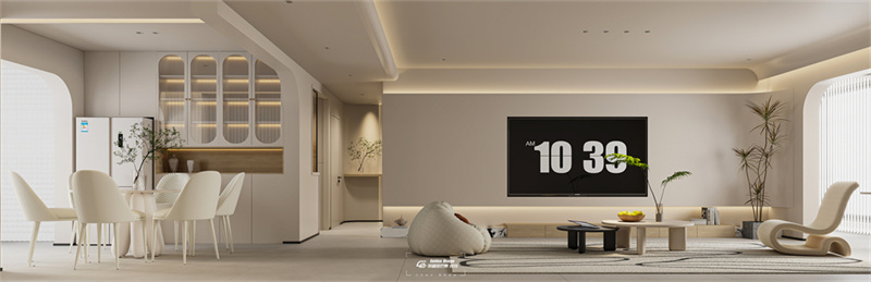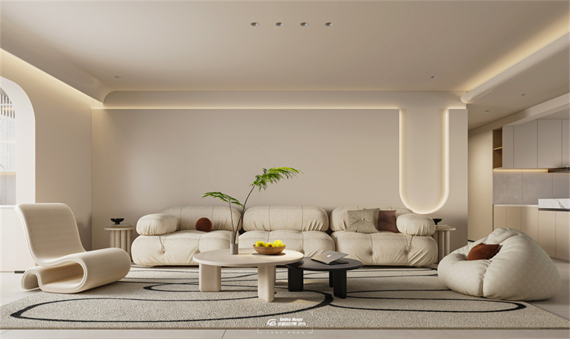 客廳沙發消失術,沙發的顏色與背景融為一體,使整個空間更加地輕盈與放松。用曲線將軟糯的溫柔質感盡情揮灑,展示著優雅且恬靜的魅力。
