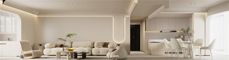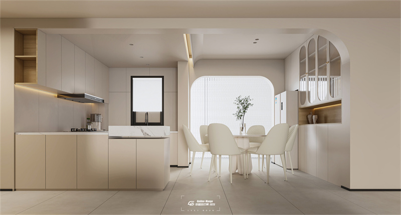 餐廚區墻頂同色,櫥柜餐桌椅選用了與客餐廳一樣的奶油色系,在視覺上放大了空間。在空間中大量運用曲面的墻體,增強空間的趣味性。