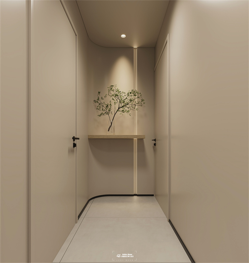 玄關處用流暢的曲線一筆鋪敘,統一的色彩運用像一幅畫作緩緩鋪開來,鋪墊著即將要進入房間的溫柔情緒。