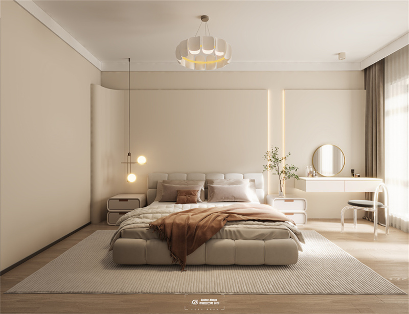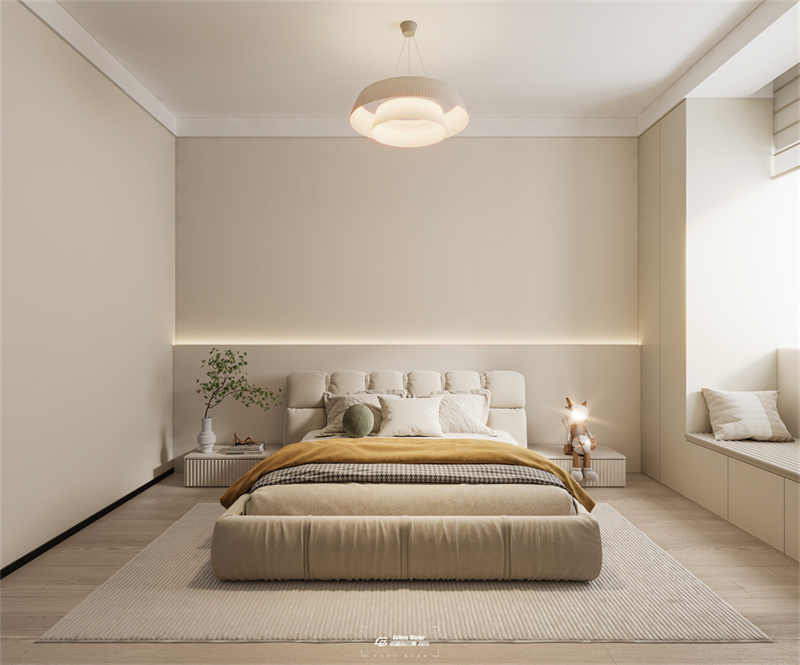 主臥依然延續客餐廳的奶油色,整個空間靜謐而細膩。
