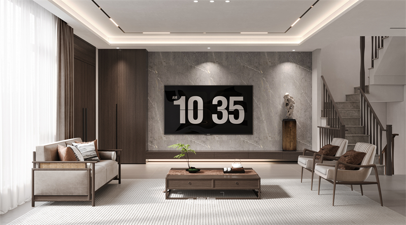 實(shí)木的沙發(fā)茶幾上是中式元素的抱枕,簡(jiǎn)潔流暢的線條仿佛在訴說(shuō)著歲月的故事。灰色石材搭配木質(zhì)家具,既有新中式的飄逸靈動(dòng),又緊跟現(xiàn)代風(fēng)格簡(jiǎn)約氣質(zhì)的時(shí)尚潮流。