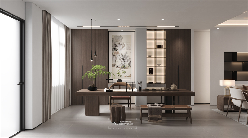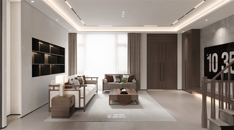 走進(jìn)這座新中式宅邸,仿佛踏入一個(gè)寧?kù)o的世外桃源,美在韻味,美在材質(zhì)。