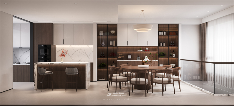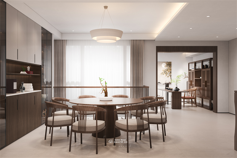 在新中式的餐廳里,品味古韻中的煙火人間。餐桌選用實(shí)木材質(zhì),紋理清晰,宛如歲月的優(yōu)雅傾訴。圓形餐桌大氣自然,更寓意圓圓滿滿,體現(xiàn)中式文化對(duì)“圓融、圓滿”的美好寄托。