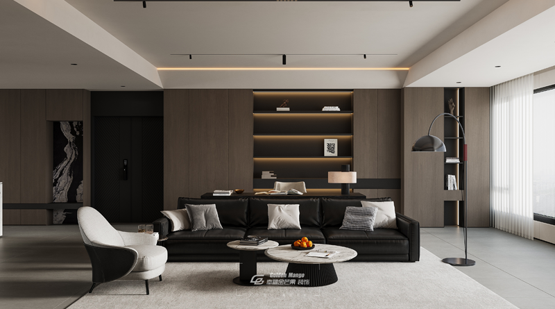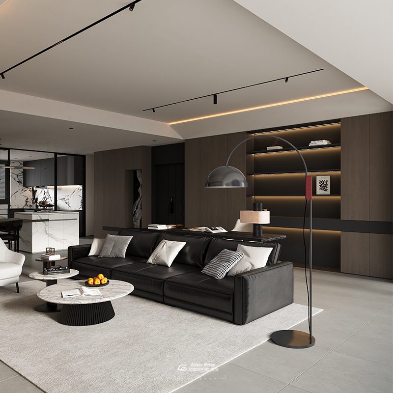 現代簡約風客廳,深木色鋪陳沉穩基調,黑皮沙發與淺調單椅碰撞質感,圓形大理石茶幾串聯空間韻律。背景墻嵌入燈帶,落地燈弧影搖曳,明暗間,陳列架上的器物悄然訴說秩序與格調。