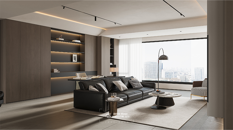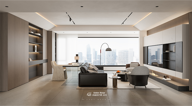 落地窗如巨幕框定城市天際線,現代客廳在硬朗與溫潤間游走。