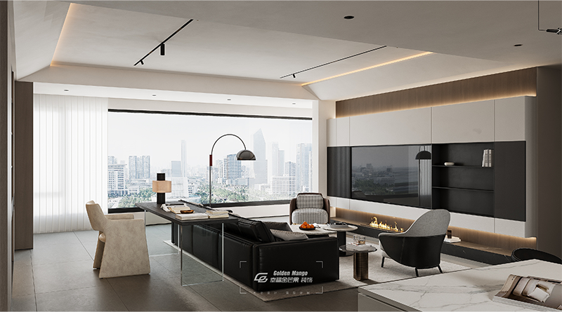 黑色皮沙發呼應壁爐星火,異型單椅、玻璃支腳案臺拆解厚重,線性燈暈漫過墻面。材質碰撞間,開闊視野與精致細節交融,織就都市棲居的從容韻律。