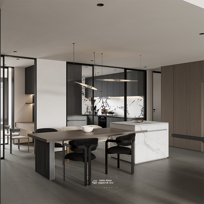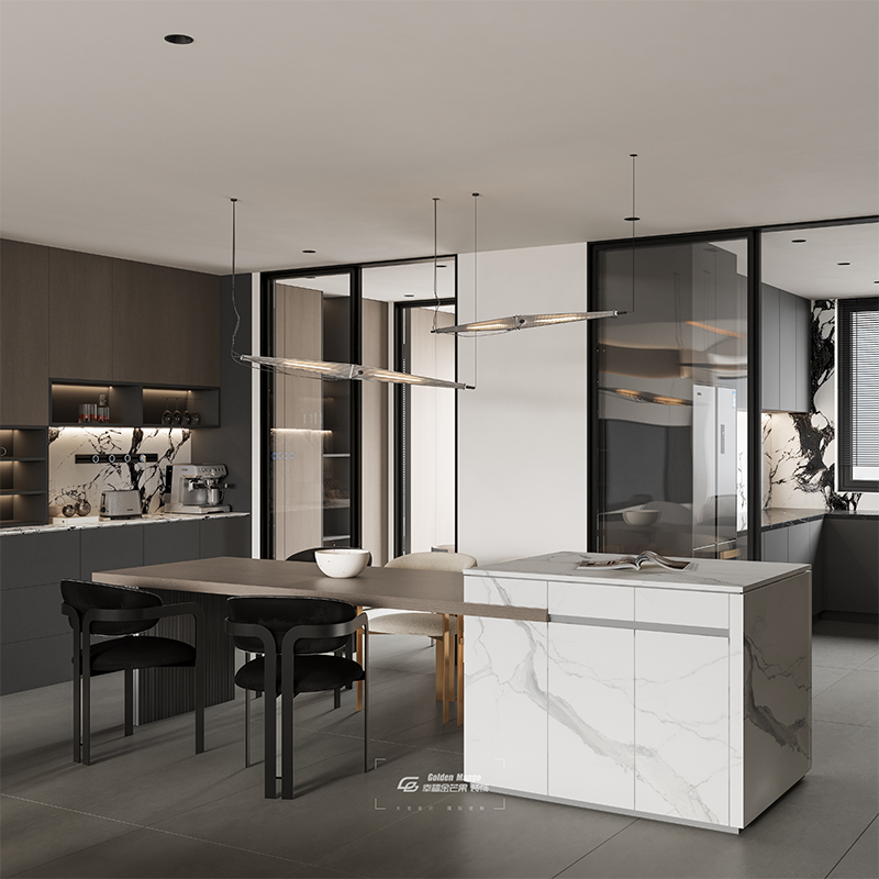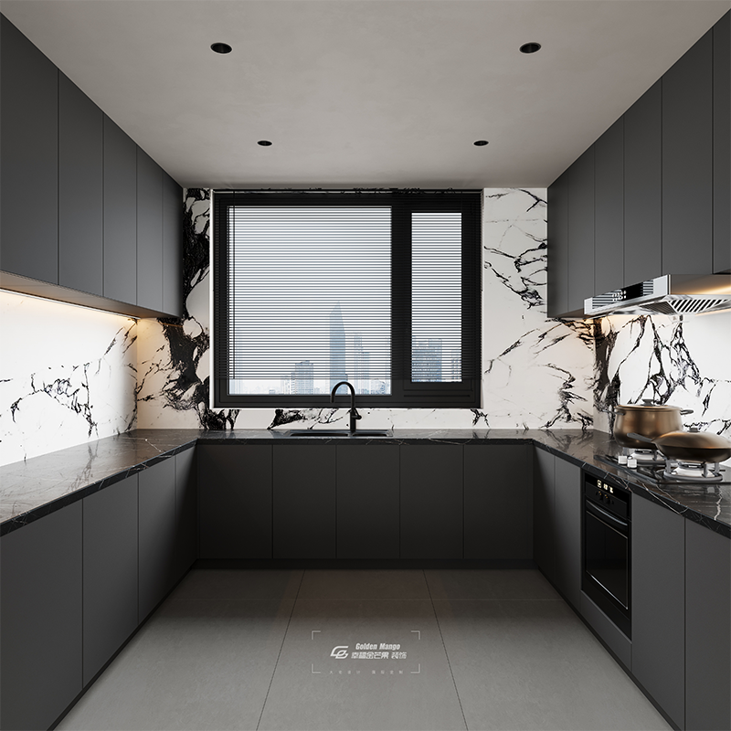 黑灰櫥柜筑就利落秩序,大理石墻似水墨潑灑肆意。嵌入燈帶暈開柔芒,百葉窗濾進城市微光。冷峻材質與流動紋理碰撞,在這方餐廚場域,把煙火日常暈染成高級詩意 。