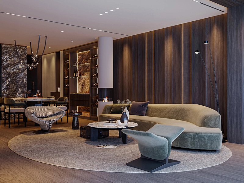 觸感的溫度:全屋通鋪煙熏橡木地板,絨面弧形沙發與羊毛地毯柔軟包裹,中和深色基調的冷峻,詮釋“少即是奢”的哲學——每一寸材質都經得起指尖的摩挲與時光的考驗。