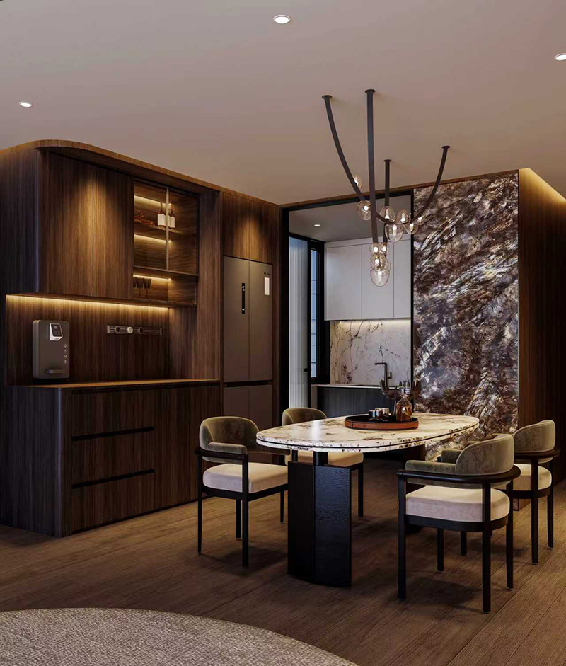 開放式設計是靜奢風放大空間感的關鍵手法。這幅餐廚一體化場景中,設計師通過材質的延續性構建視覺統一性:餐廳區域的胡桃木飾面延伸至廚房吊柜,而廚房中島臺面的雪花白大理石,則與餐桌石材形成材質呼應。黑色隱形門框與嵌入式冰箱的設計,將 “less is more” 的理念貫徹到極致,唯有酒柜玻璃門內的金色酒具與金屬裝飾條,在克制中透露著精致。細節處可見設計師對生活場景的深度考量:廚房操作臺下方的隱藏式燈帶,解決了切配時的背光問題;餐廳角落的恒溫酒柜(容量 80 瓶)采用雙層 Low-E 玻璃,既隔絕紫外線又保持柜內溫度穩定;而餐椅的 45° 傾斜靠背設計,則在視覺輕盈感與坐感舒適度間找到了完美平衡點。
