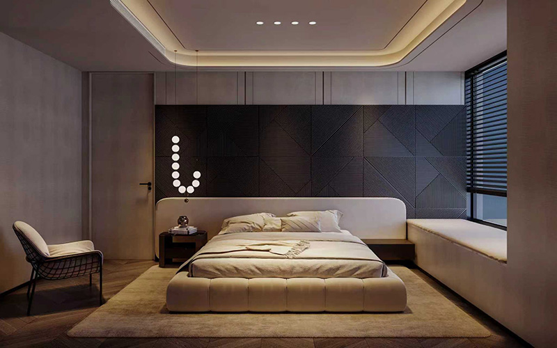幾何心機:臥室背景墻暗藏不對稱幾何分割,搭配嵌入式2700K射燈,光影在墻面繪出抽象畫作,細節處見大師手筆。