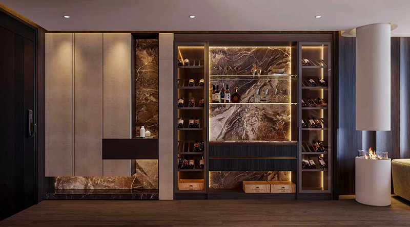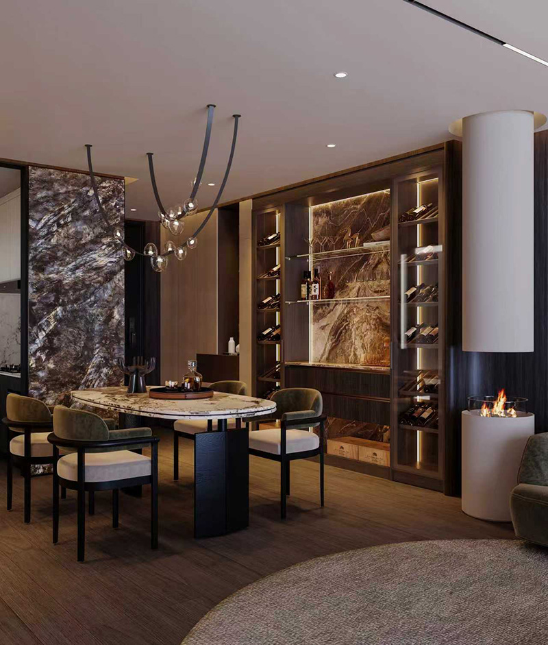 靜奢風格的靈魂在于材質的純粹表達。畫面中央,不規則大理石紋理的背景墻如山水畫卷般鋪展,深棕與米白的自然肌理在嵌入式暖光的映照下,呈現出玉石般的溫潤光澤。與之形成材質對話的是深色胡桃木酒柜,豎條紋的木飾面通過精密的拼接工藝,在視覺上延伸了空間高度,內置的感應式層板燈將珍藏的酒品輪廓勾勒得如同藝術展品。