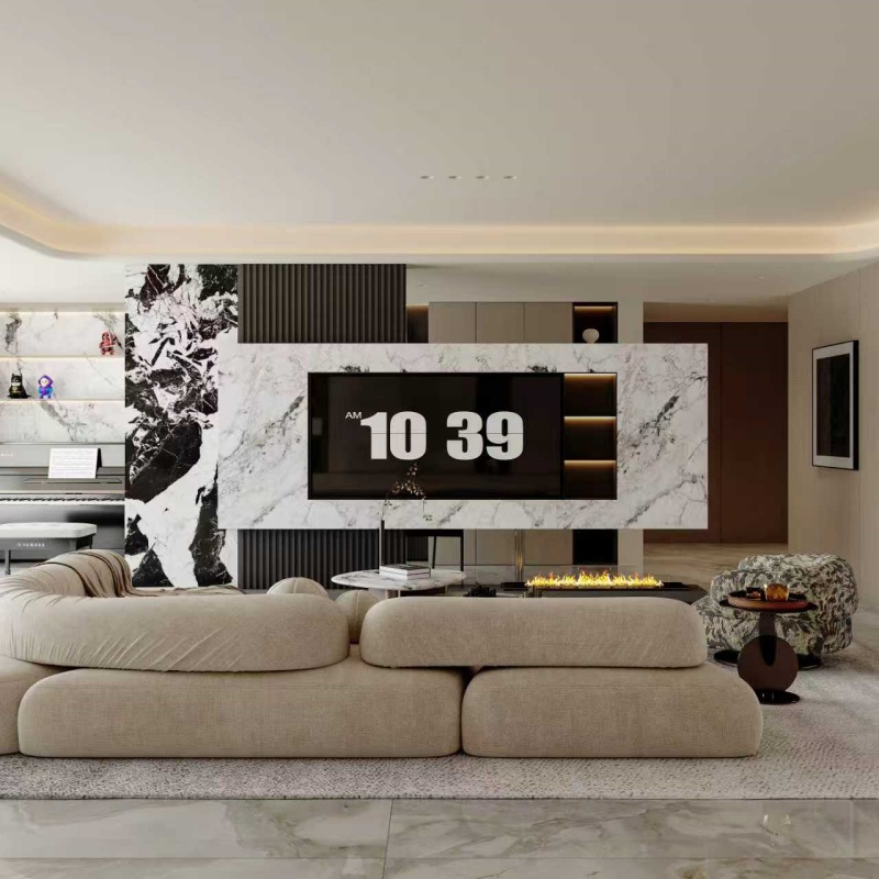 客廳是空間的靈魂舞臺(tái)。大理石元素裝點(diǎn)墻面,電視區(qū)域的黑白紋理,如同藝術(shù)畫作,與周圍的現(xiàn)代家具碰撞出奇妙火花。米色的大沙發(fā)柔軟且富有設(shè)計(jì)感,慵懶地容納著日常的愜意。一旁造型獨(dú)特的單人椅,成為空間的個(gè)性點(diǎn)綴。嵌入式的陳列區(qū),擺放著精致小物,鋼琴的存在,又為生活增添藝術(shù)韻律,這里既是家人歡聚的溫馨場(chǎng),也是社交會(huì)客的時(shí)尚領(lǐng)地 。