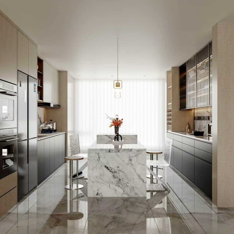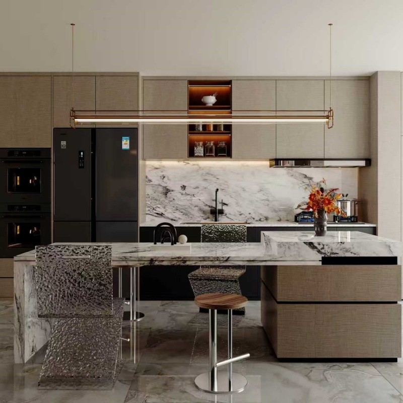 廚房區(qū)域,是實(shí)用與美學(xué)的共生體。一體化的櫥柜設(shè)計(jì),淺木色與黑色電器形成經(jīng)典配色,讓烹飪操作臺(tái)面充滿高級(jí)質(zhì)感。中島臺(tái)的設(shè)置,拓展了操作與互動(dòng)空間,在這里,烹飪不再是單調(diào)的家務(wù),而是一場(chǎng)與美食、家人互動(dòng)的精致體驗(yàn),烹飪時(shí)光也能滿是優(yōu)雅 。