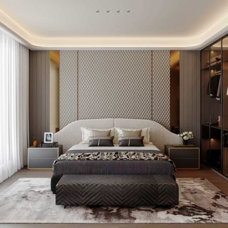 步入臥室,柔和的燈光如絲般傾瀉,勾勒出空間的優(yōu)雅輪廓。床頭背景墻的菱形紋理,帶著細(xì)膩的質(zhì)感,搭配淺米色軟包床頭,營造出溫潤(rùn)氛圍。兩側(cè)簡(jiǎn)約的床頭柜,承載著生活小物,一旁的衣柜采用玻璃與木質(zhì)結(jié)合,衣物陳列清晰,又添幾分通透與時(shí)尚,讓休憩空間滿是靜謐高級(jí)感 。