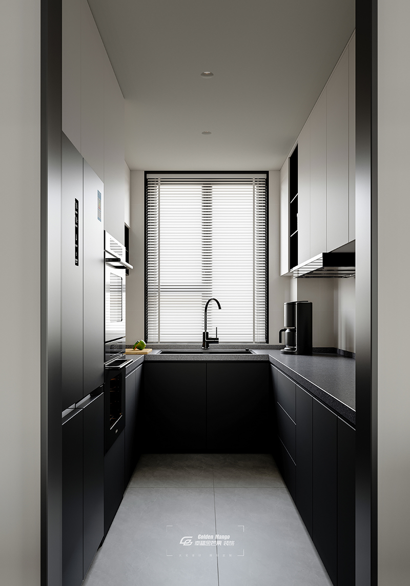 廚房的設(shè)計更是利落得很!黑白配色,看著就干凈清爽。黑色櫥柜把各種雜物都藏得嚴(yán)嚴(yán)實實,臺面一塵不染,強(qiáng)迫癥看了都得偷著樂。U 型布局把空間利用得剛剛好,洗菜、切菜、烹飪,動線流暢得像流水線。