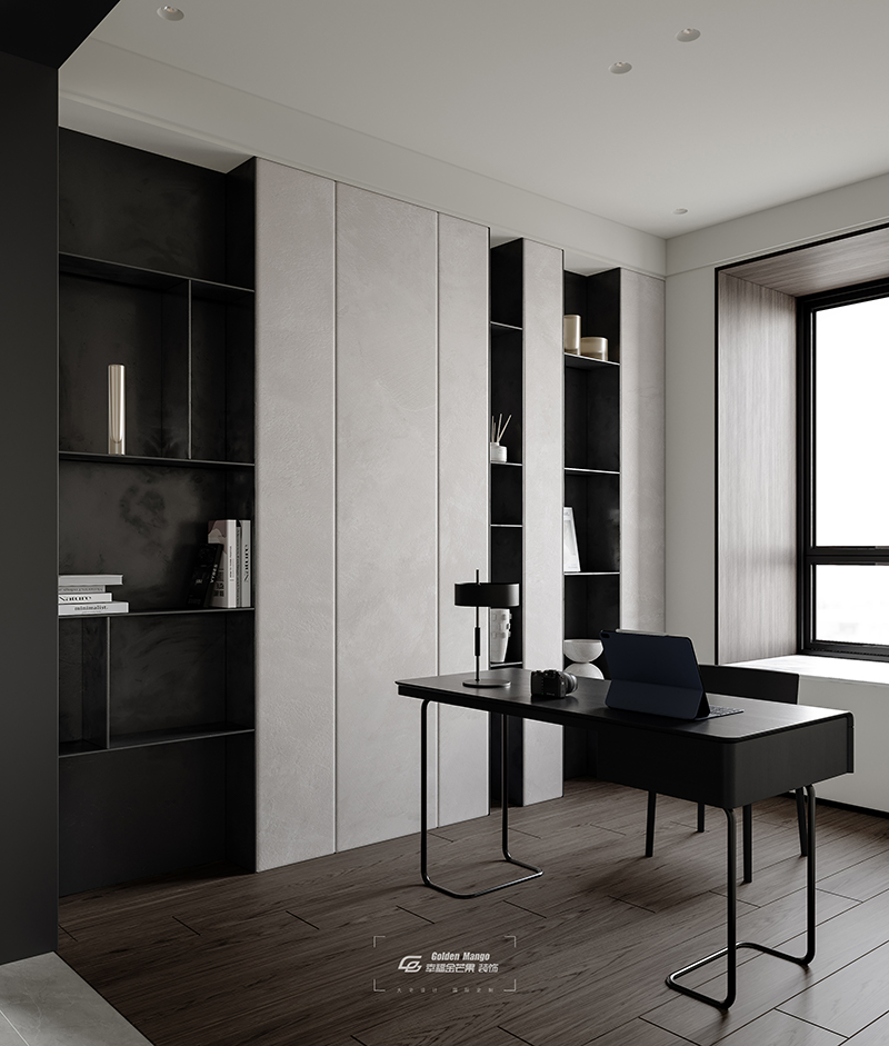 書房的空間不算大,愣是給裝出了格調(diào)。黑灰白的色調(diào),簡約又高級。書桌是黑色臺面搭配金屬桌腿,上面的臺燈一開,光都帶著高級感。桌是黑色臺面搭配金屬桌腿,上面的臺燈一開,光都帶著高級感。