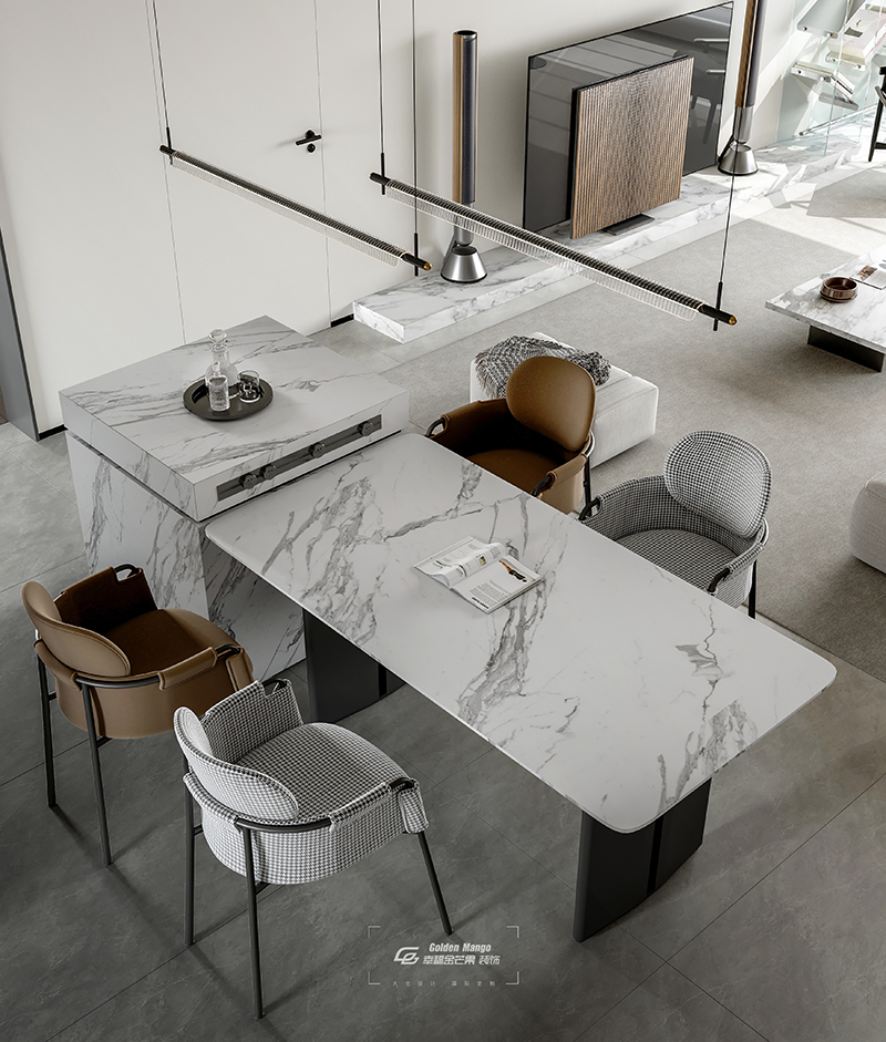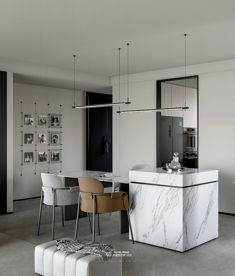 再看看餐廳,白色大理石餐桌居中而放,紋理優(yōu)雅得不像話,搭配的餐椅也很有特點,既有編織紋理的現(xiàn)代感餐椅,又有棕色皮革餐椅,坐感超棒,而且顏值也在線。