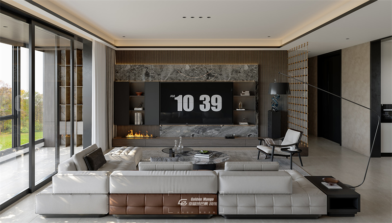 背景墻采用石材與木質(zhì)結(jié)合,中間嵌入大屏,兩側(cè)的收納架實用且具裝飾性,下方的壁爐設計為空間增添了溫馨氛圍。