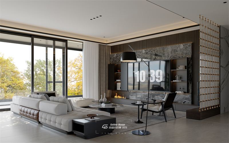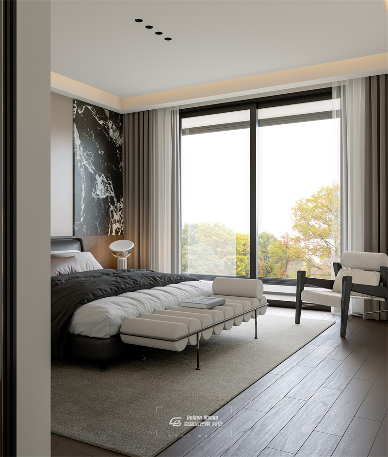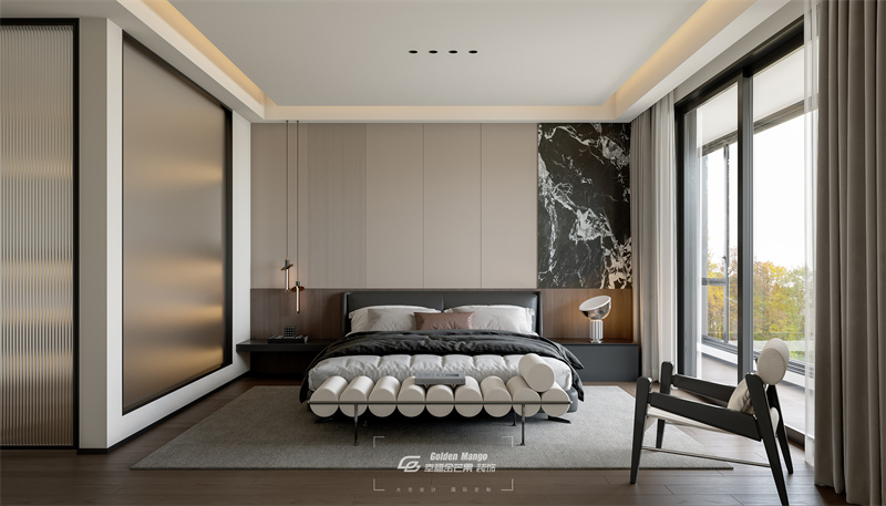 墻面部分采用帶有紋理的板材與大理石裝飾畫,層次分明且質(zhì)感卓然。大面積的落地窗引入充足自然光線,讓室內(nèi)通透敞亮,窗外的景色也成為空間的一部分,進一步提升了居住的愜意感。