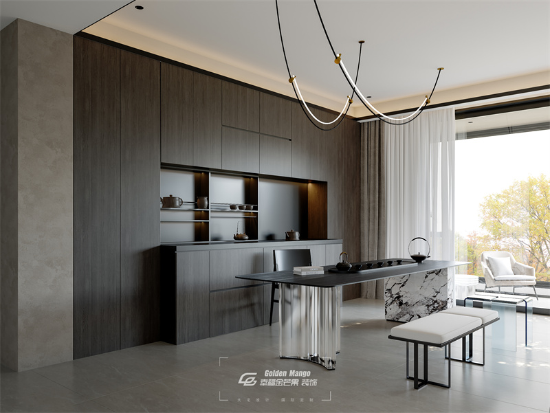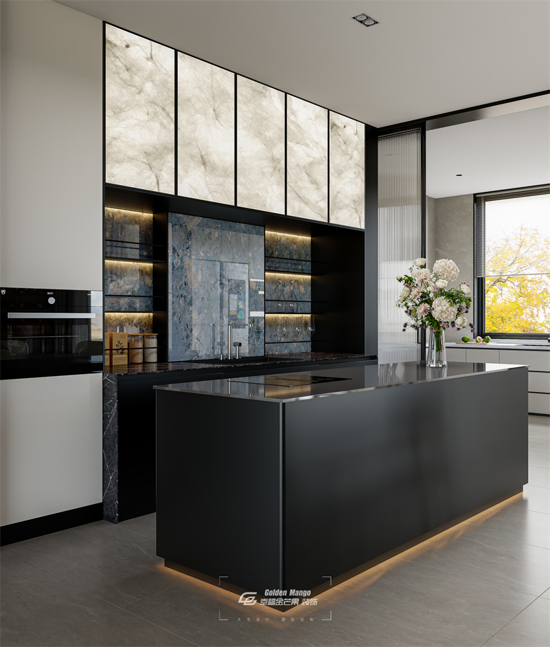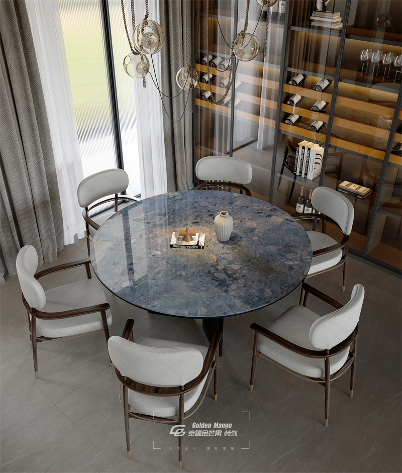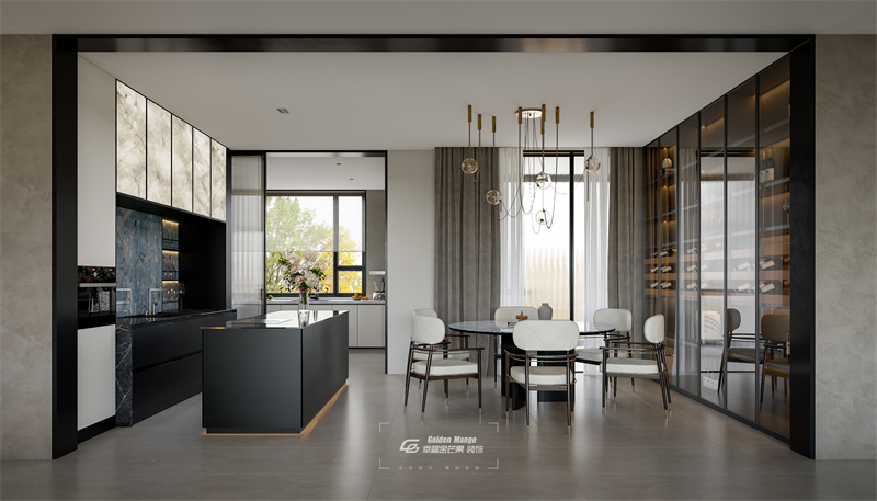 整體設計簡約大氣,廚房以黑白為主色調(diào),深色中島臺搭配帶有大理石紋理的墻面與柜體,簡潔又富有質(zhì)感,嵌入式電器與合理的收納布局,兼顧美觀與實用;餐廳區(qū)域,圓形大理石餐桌質(zhì)感卓然,搭配淺色系座椅,溫馨又舒適,一旁的玻璃酒柜陳列有序,增添了空間的格調(diào),上方造型獨特的吊燈更添藝術氛圍。