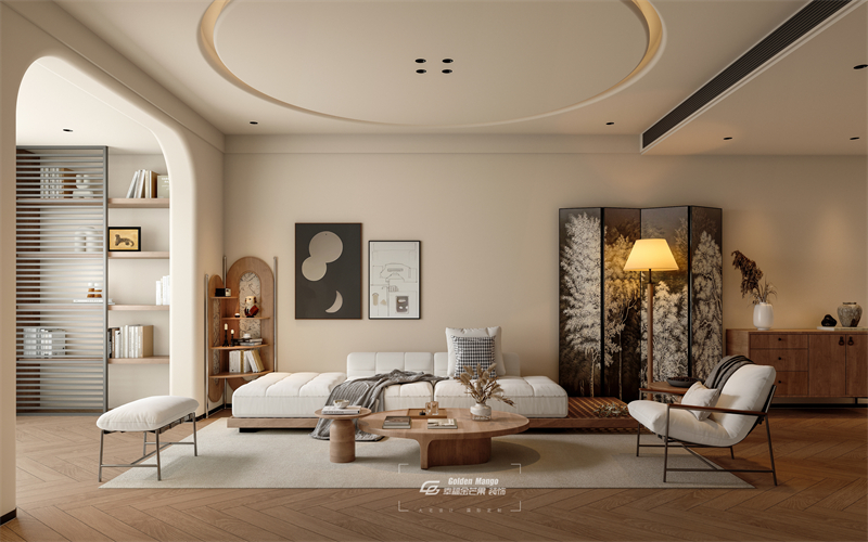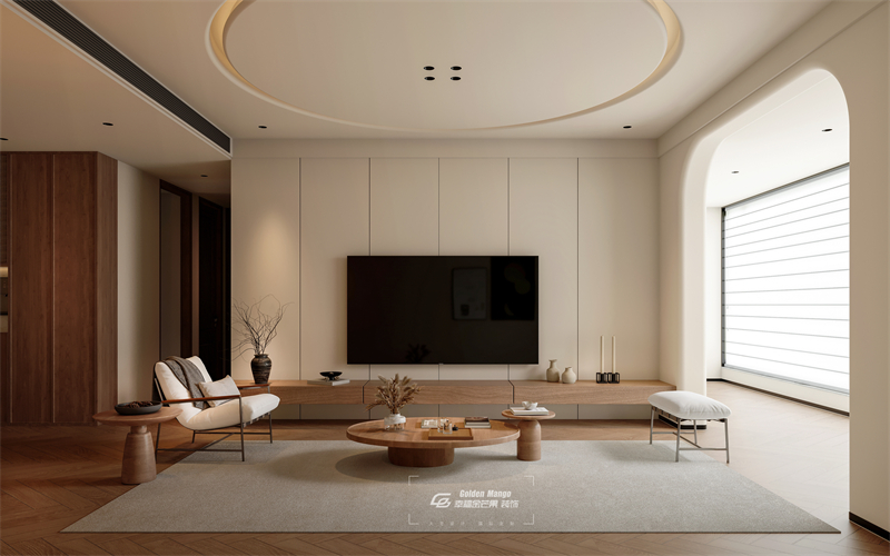 空間以淺色調為主,搭配木質元素,營造出溫馨自然的氛圍。家具造型簡潔,線條流暢,如圓潤的茶幾、簡約的沙發,盡顯舒適與時尚。