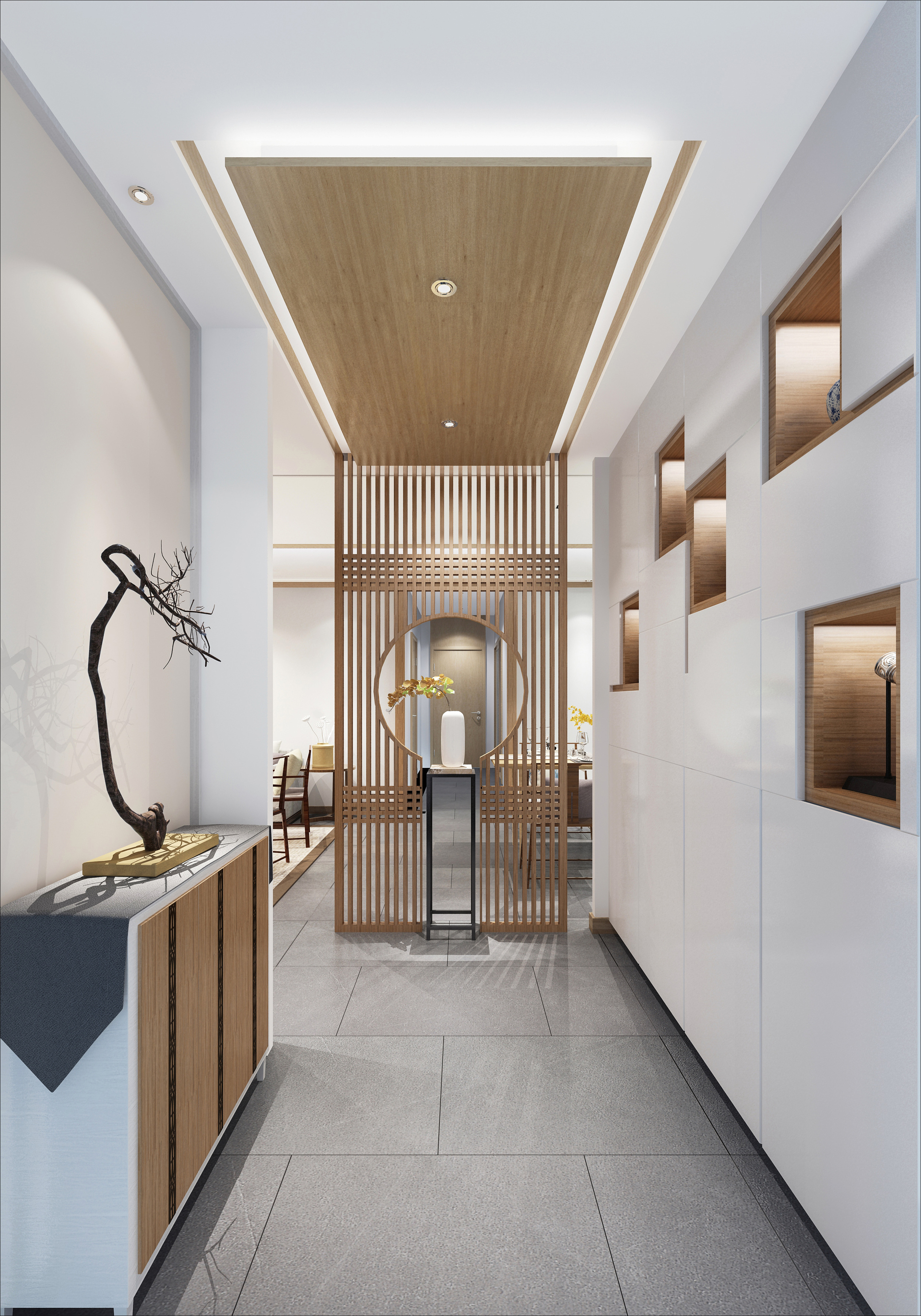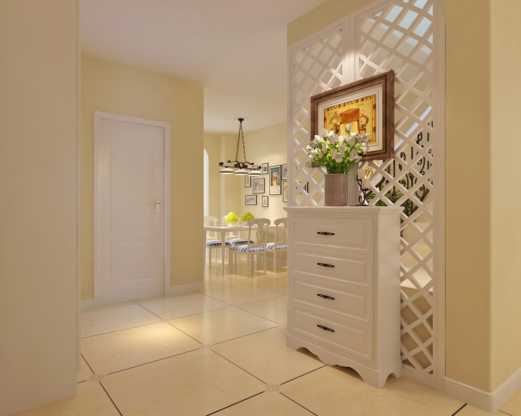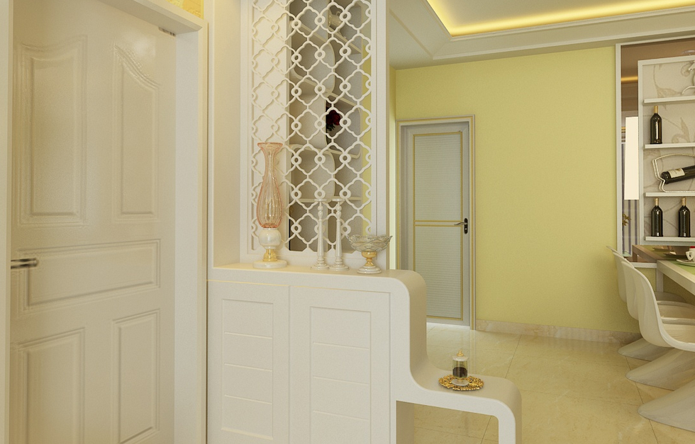 5、墻壁的間隔之間需要下實上虛,正對大門的玄關最佳的選材是上半部最好是明亮的材料,下半部最好是墻或者木板。