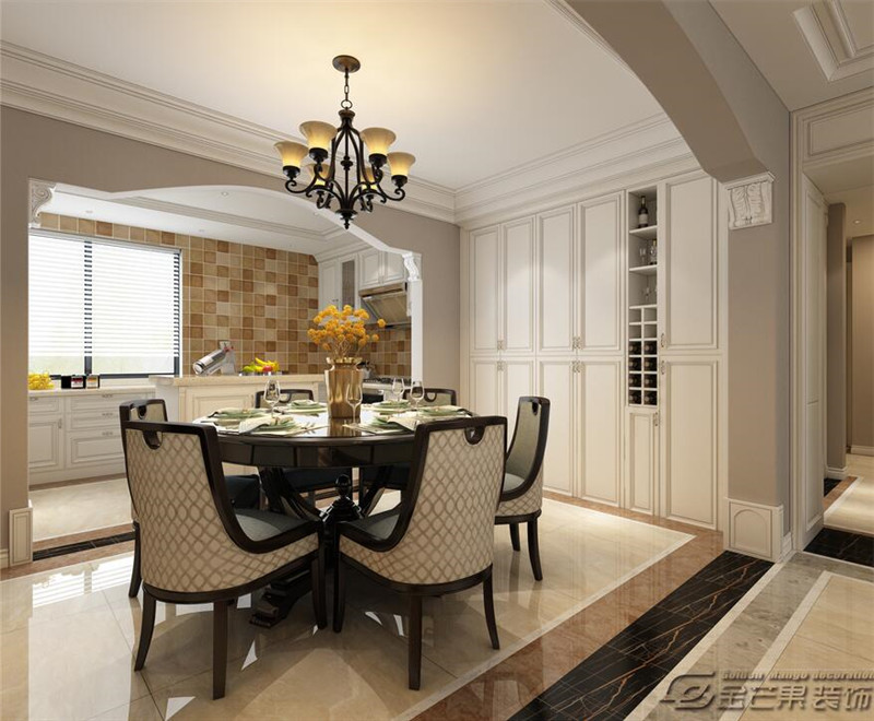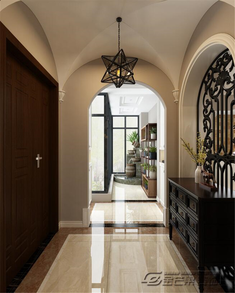 為了避開進門直對餐廳的風水問題,設計師在進門處設計了鐵藝鏤空玄關,在配上拱形門洞、弧形吊頂,再搭配一盞極具特色的燈具,絕對是進門的一大亮點。