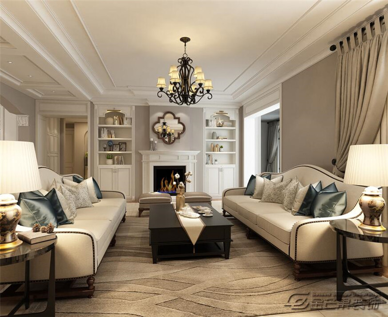 業主認為客廳是一家人忙碌后坐在一起溝通交流、放松的地方,所以用壁爐造型代替的電視墻,兩邊設計的展示柜,美觀又實用,再結合優雅的線條框架,整體充滿了優雅的氣息。