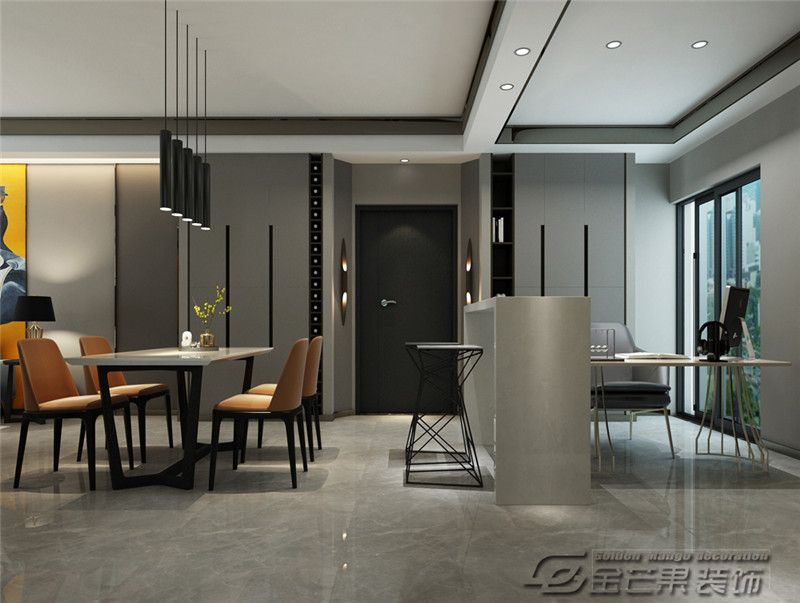 整個(gè)空間采用大量的灰色系元素,極簡(jiǎn)的樣式與深沉凝練的紋理,大氣而干練讓空間充滿著高度成熟而內(nèi)蘊(yùn)的意趣。設(shè)計(jì)師考慮到客餐廳比較寬闊,在原餐廳處增設(shè)輕食吧臺(tái),為餐廳空間營(yíng)造了不同的生活情趣。