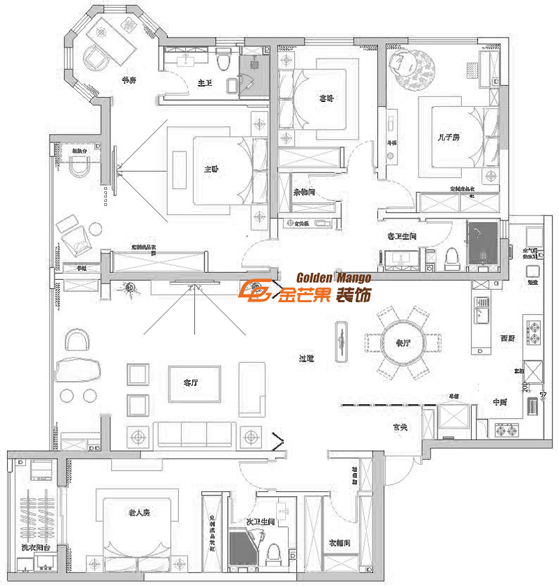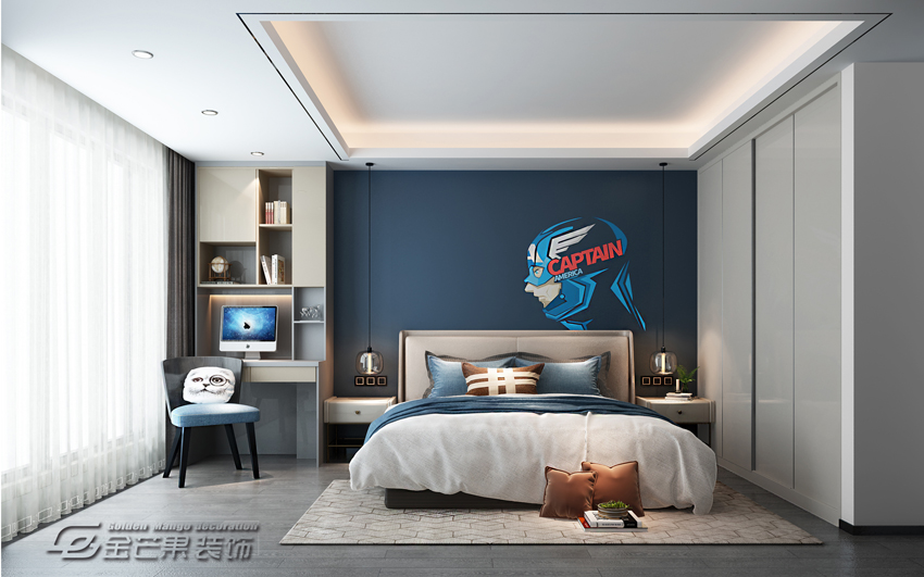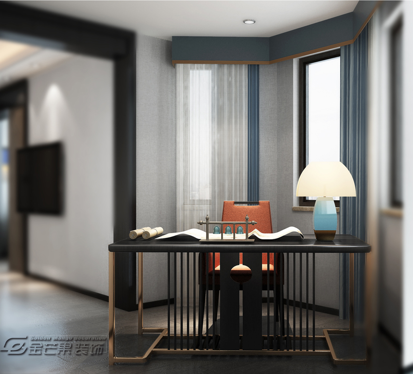 在臥室空間的處理上,將西方的文化與東方的韻律做有機的結合,希望營造的是更符合居住者本身的獨特審美,并且利用主臥的八角陽臺區域設計為主人的書房空間。