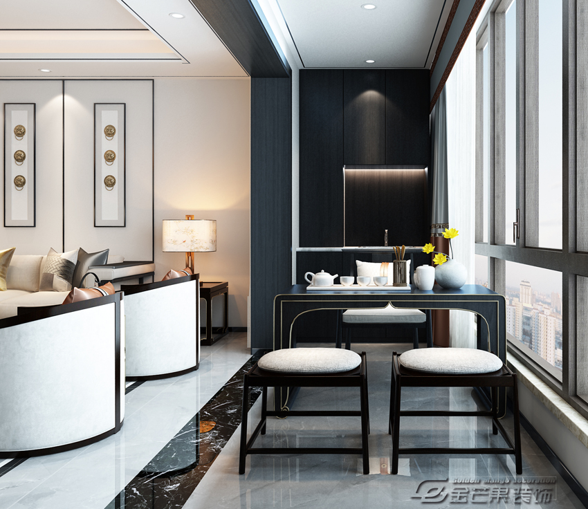 本案業主年輕有為,自主打拼事業做生意,對生活品質有一定的追求。男業主閑暇時喜歡茶道,沏壺小茶品一品。所以在風格的定位上,喜歡現代的風格中融入一些古典的韻味,定調為新中式。在空間布局上,本案原廚房空間狹小,把原有生活陽臺區域做了融入了廚房一體,并做了開放式廚房,把客廳陽臺打通包入客餐廳。使廚房空間不顯得局促,又使整體空間更加大氣。