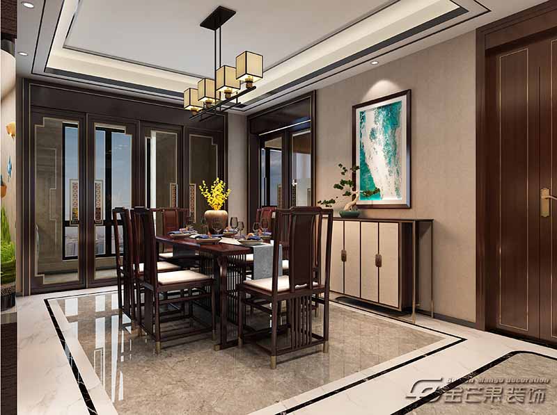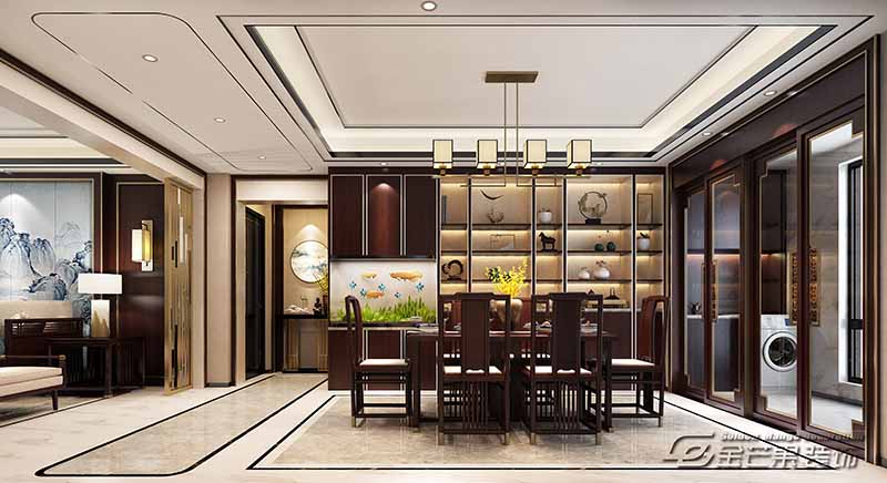 與廚房相連的餐廳,布置的也比較仿古化,實木六人桌與背景墻上壁畫、嵌入式魚缸相得益彰。方形的天花上垂墜的吊燈,高低間展現出古雅韻調。