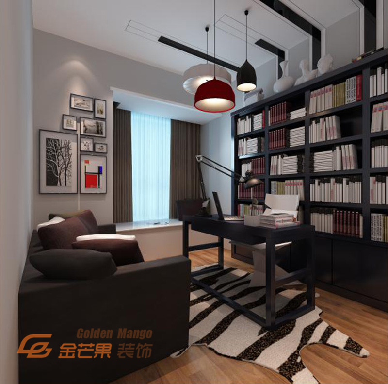 書房用深色簡約的沙發,書柜,辦公桌及吊燈來打造,實用與裝飾融為一體,整個就是一個很安靜的感覺,既能讓您在書房中認真的辦公,也能更安靜的思考遐想。