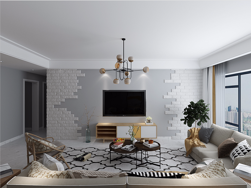 在客廳的設計中尤其突出設計的用心,客廳以灰色為背景,頂色依舊為經典的白色,百色磚貼在兩邊錯落有致,立體吊燈和鑲在墻內的電視更是增強了客廳的空間效果。窗簾則選用三層,為了搭配整體效果最外層選用白色,中間的一層則是主要的遮光作用,干凈利落體現無疑。