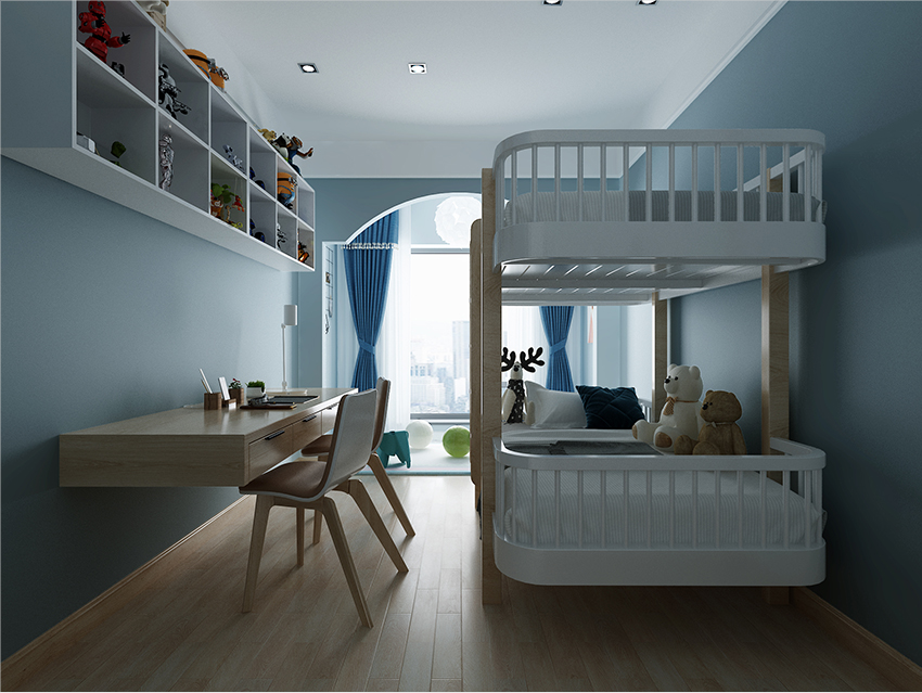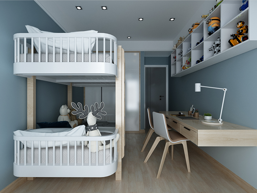 兒童房則選用高低床經濟實用的同時又美觀。桌臺簡潔大方,收納格子放滿玩具人物的模型,孩子每天起床映入眼簾的正是這些精美模型,愉快的一天就此開始,錯落的射燈保護孩子眼睛,又有一種星空般的感覺。小陽臺則主要以娛樂玩耍為主。真正的休息、學習、玩耍三不誤。
