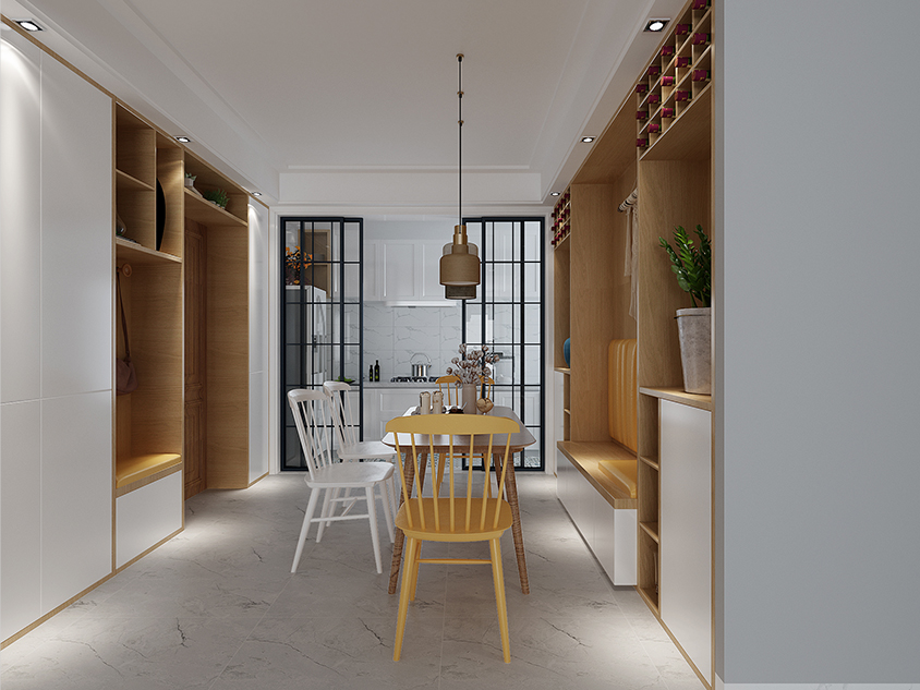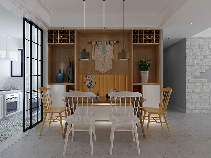廚房和用餐區則以格子透明的玻璃推拉門巧妙的隔開,廚房整體呈現白色,上下兩層收納柜可以放下你足夠多的廚具和餐具。如果說白色搭灰色是積極、活潑的,那么黑色的門框則表現得沉著、穩重和冷靜。擺滿格子的酒是和遠道而來的朋友小酌一杯的底氣所在,也是夫妻兩人一品紅酒的浪漫所在,整個用餐的地方也加入許多線條的元素。