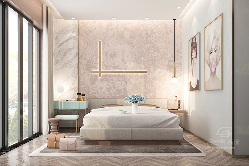 這兩個臥室在設(shè)計布局上有異曲同工之處,第一眼感覺就是女孩子的閨房,淡淡的粉色映入眼簾、整潔明亮。壁畫在此時則是文藝范十足的顯現(xiàn),大落地窗讓窗外的美景盡收眼底,增加通風(fēng)和采光。梳妝臺是精心準(zhǔn)備的開始。整體表現(xiàn)得溫馨,充滿少女心。