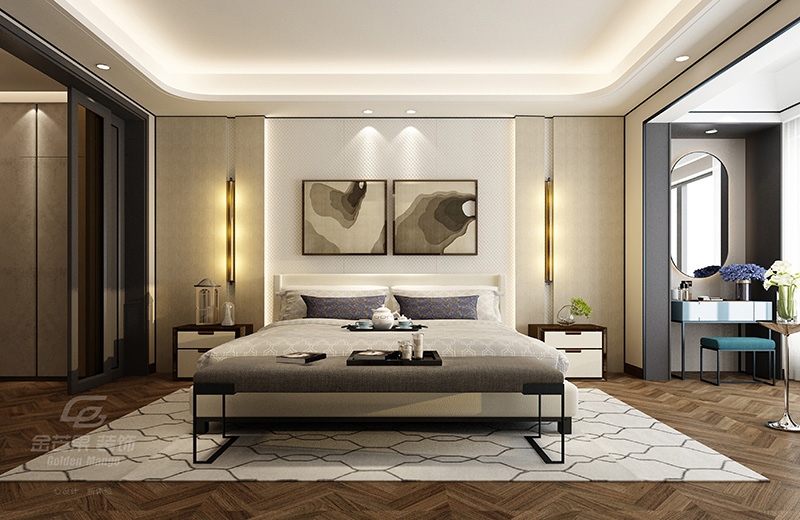 主臥在設(shè)計布局上則是簡約,地板用木質(zhì)地板,也是主人質(zhì)感生活的表現(xiàn)。頂上環(huán)形的燈光保證了房間的照明,梳妝臺也是美好一天的開始。