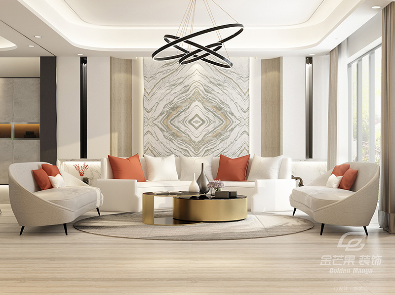 客廳的裝修整體顯得明亮透徹,表明主人待客之道:真誠、以心相待。背景墻用抽象性極強的圖案,引人遐想。吊燈設(shè)計新穎,空間、立體感極強。米白色沙發(fā)讓你和客人舒心暢談。