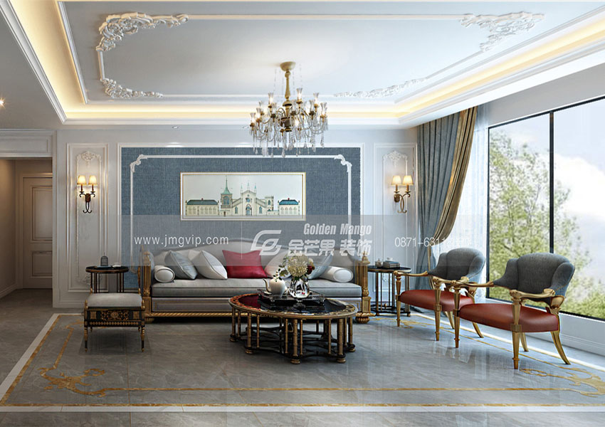 設(shè)計布局上沒有絲毫的掩飾,不論是大方的落地窗簾,還是頂上精美的雕花,亦或是晶瑩碧透的地磚等等,都在流露著豪華和優(yōu)雅。背景墻也和窗簾交相呼應(yīng)。雕刻精細的沙發(fā)和椅子,高貴典雅。