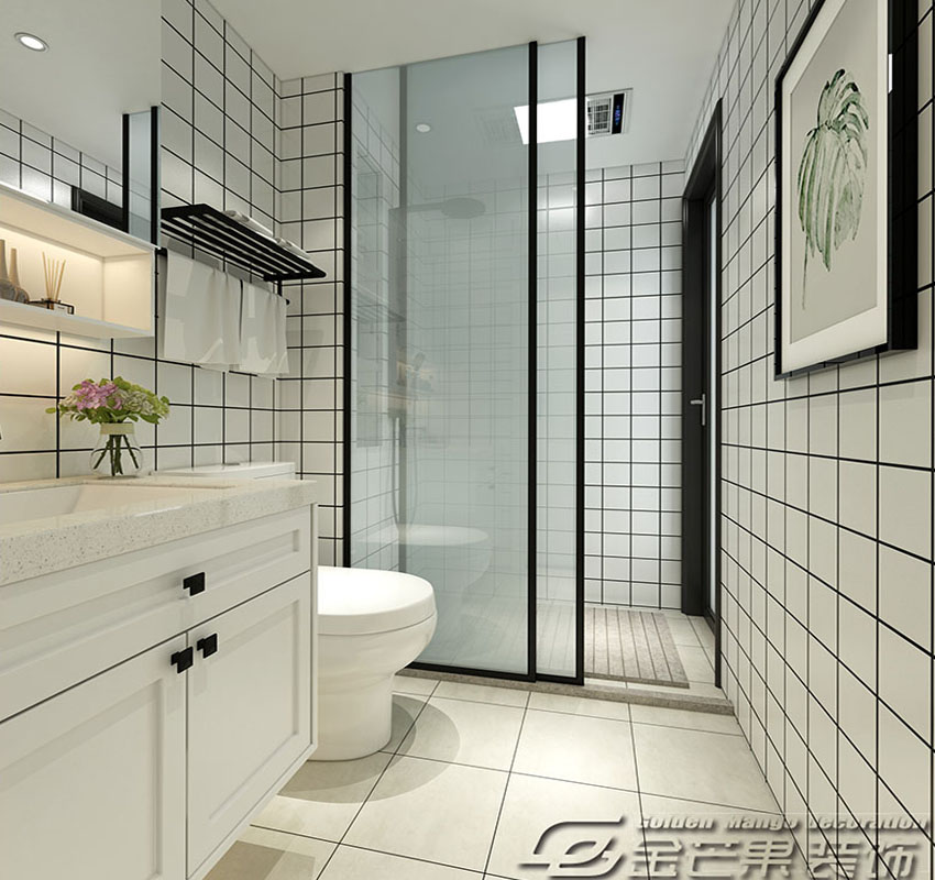衛(wèi)生間帶有強(qiáng)烈的空間感,用乳白色正方形的瓷磚加以黑色邊縫突出整體效果,干濕分離,干凈美觀。