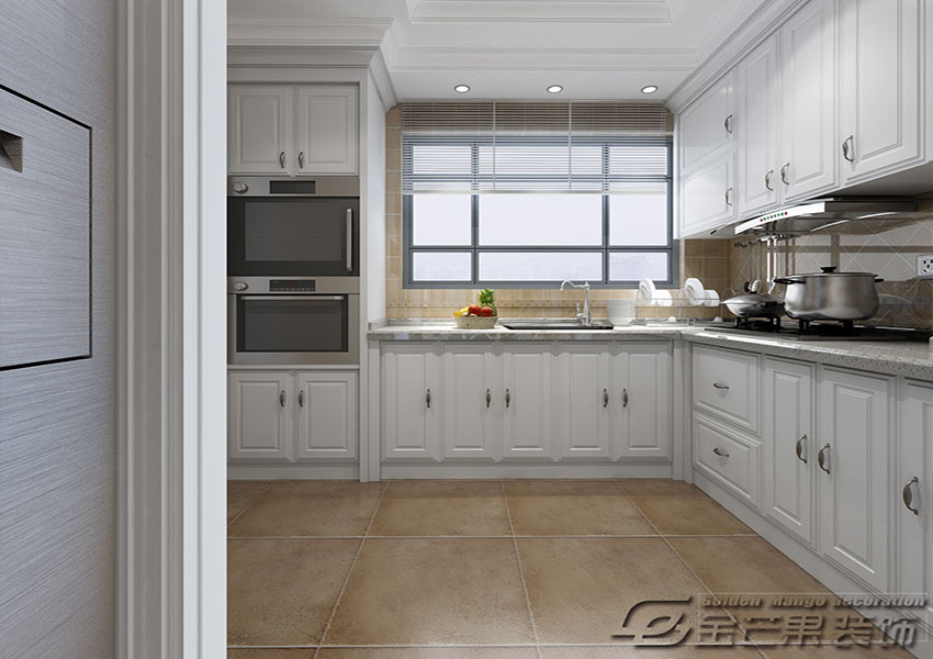 全套白色的櫥柜顯得干凈、美觀。還有陳舊式的地磚滿懷懷舊之心,烤箱也是美式風格必不可少的一員,櫥柜也提供了完美的收納空間。