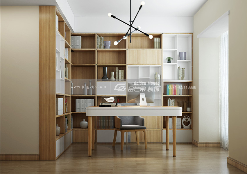 書房則是遵循簡單原則,柜體上以多個格子隔開,分類上更加清晰明了,落地窗提供了個更好的采光性。許多木材的元素更加富有質(zhì)感。