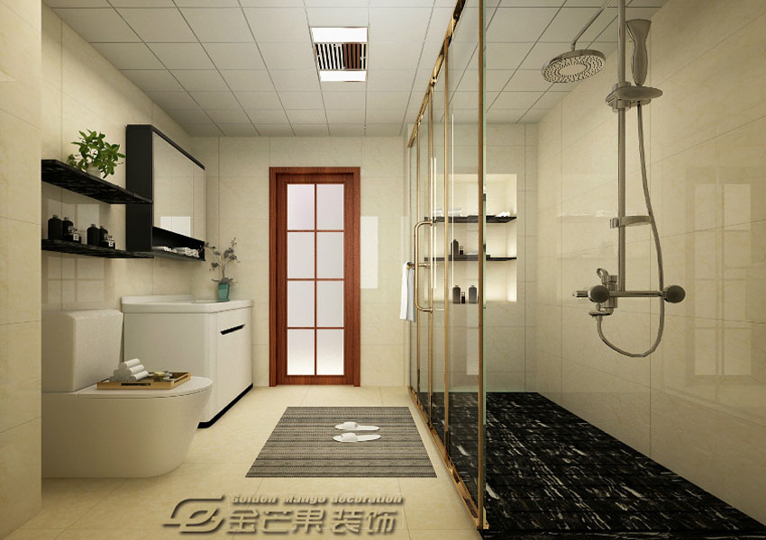 懸吊的淋浴,有著較大的沐浴空間,在沐浴時更能隨心所欲,外面的防滑毯子更加貼心溫暖,干濕分離的衛生間顯得干凈美觀。門框也用了中式元素。