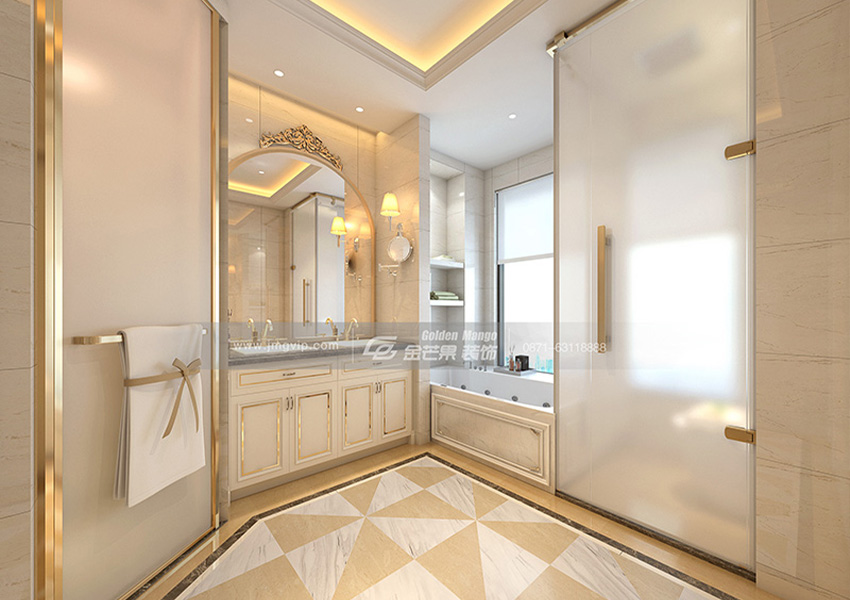 干濕分離才是最基本的,磨砂的玻璃門,若隱若現(xiàn),神秘美觀。鏡框的設(shè)計(jì)是一頂皇冠,以壁燈照亮你的美,怎么少得了浴缸的搭配,盡情放松疲憊一天的身體。整體盡顯高貴、奢華。