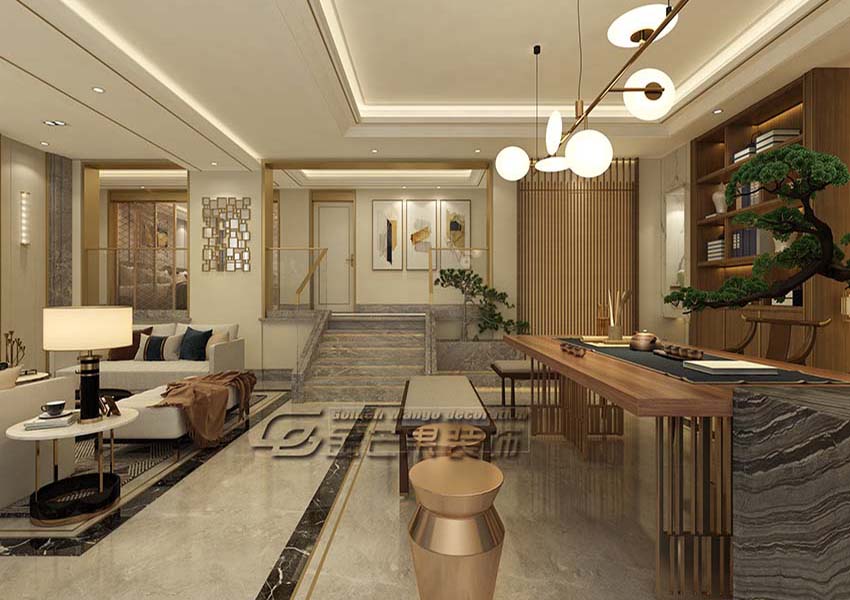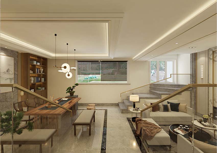 在茶室區有著強烈的中式味道,品的是茶,品的也是人品,更是待客之道。案桌上的云客松,也是主人對待客人的態度。在屋頂以燈帶和線條元素作搭,層次更加清晰明了。