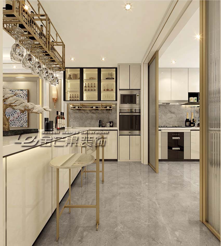 開放式的廚房,搭配上乳白色的柜體,更顯高貴、實用。設置有吧臺,存有很多珍藏的美酒,一飲而盡也是極致享受。餐廳的座椅則是巴洛克的體現,坐感更加舒適,琳瑯滿目的吊燈,帶著工業的風格。旁邊的鋼琴,成為演繹音符的最佳地方。